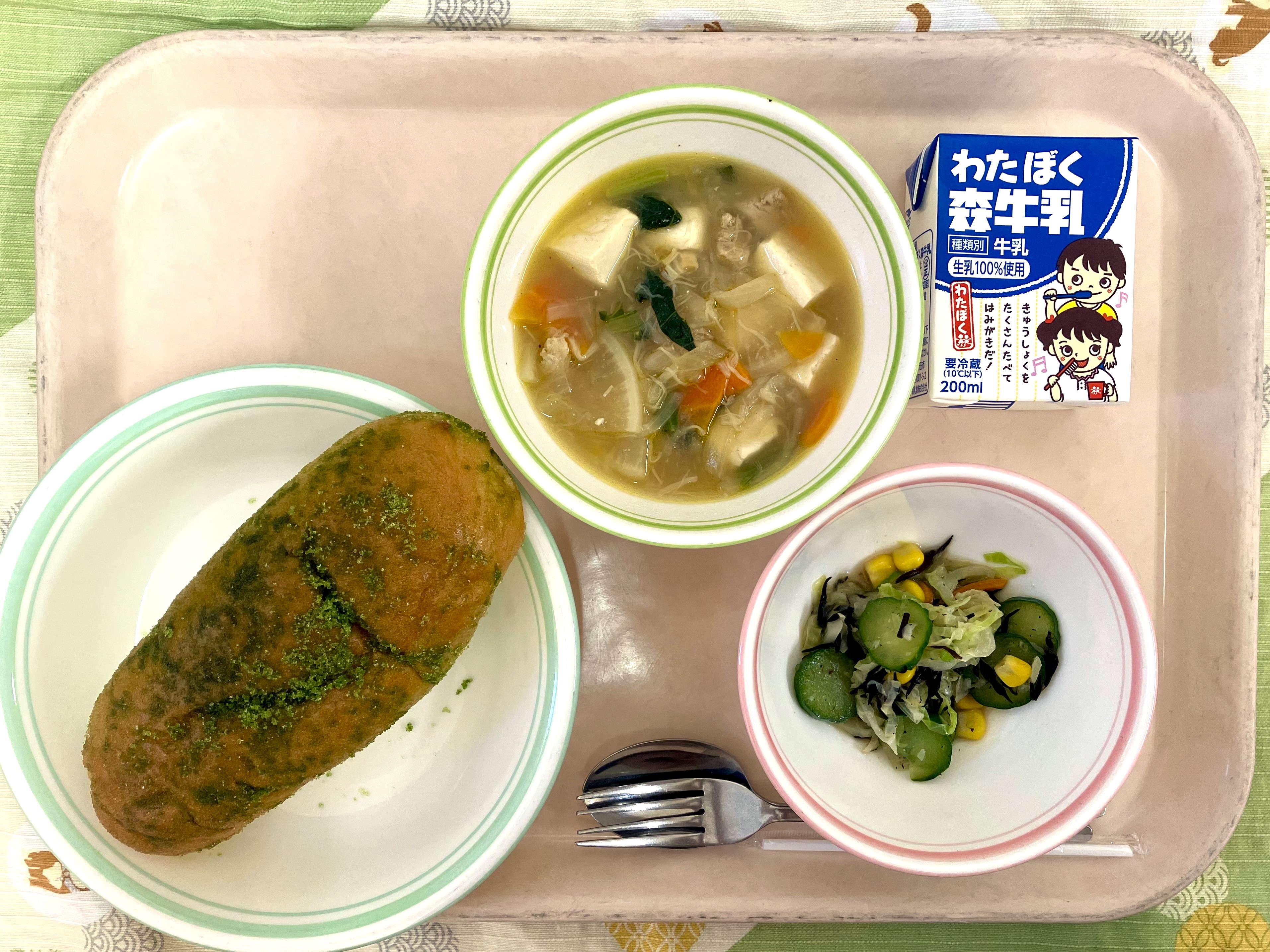 来週がつぼみの日のため、大成小学校と共通献立でした。揚げパンには狭山茶を使用しました。