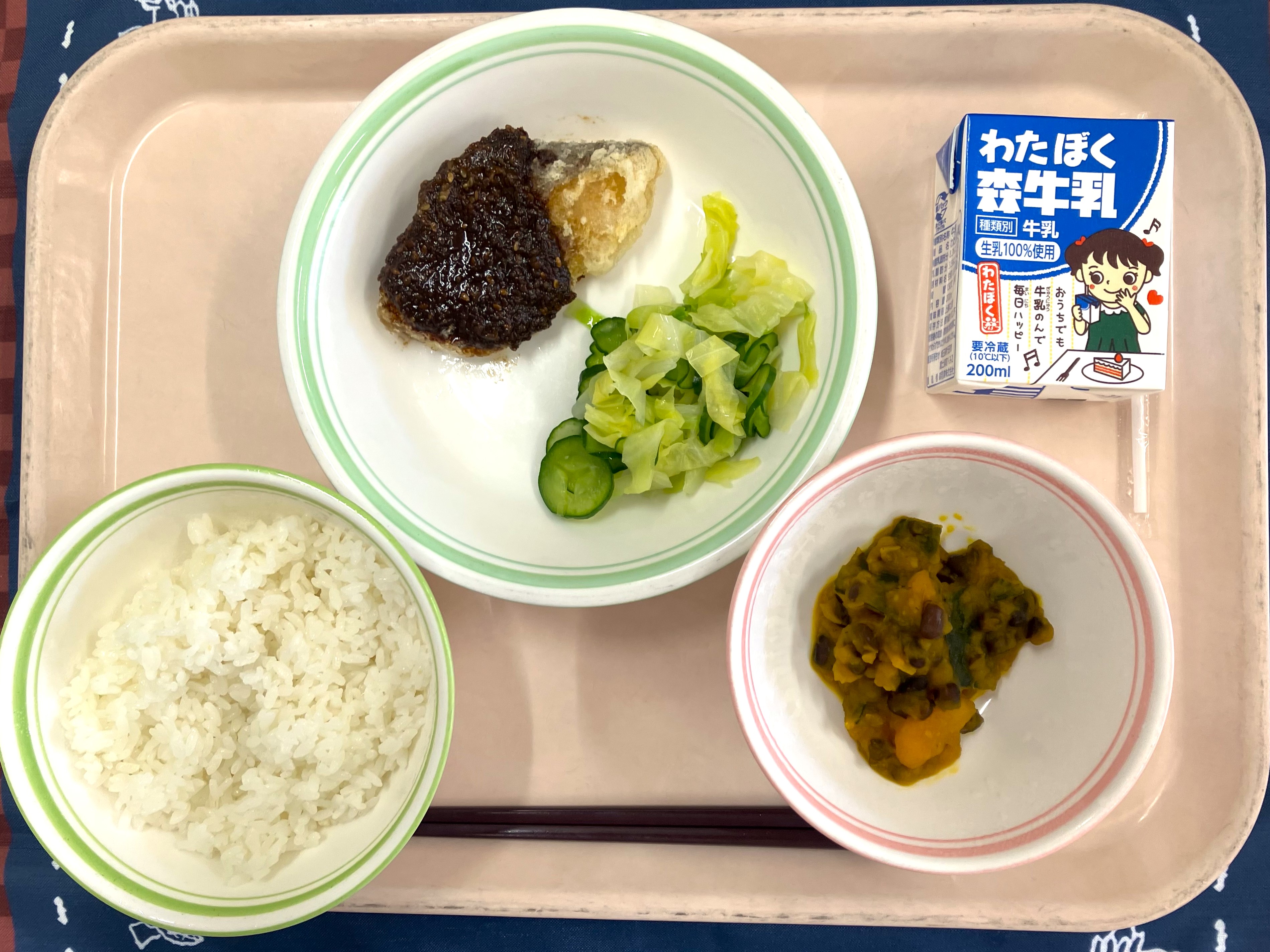 今日は給食最終日でクリスマス献立です。ハンバーグは調理員さんが1つ1つ丁寧に成形してくださり、ソースも厨房で作った給食室完全オリジナルハンバーグです。3学期もまたたくさん給食を食べてくれると嬉しいなと思います。